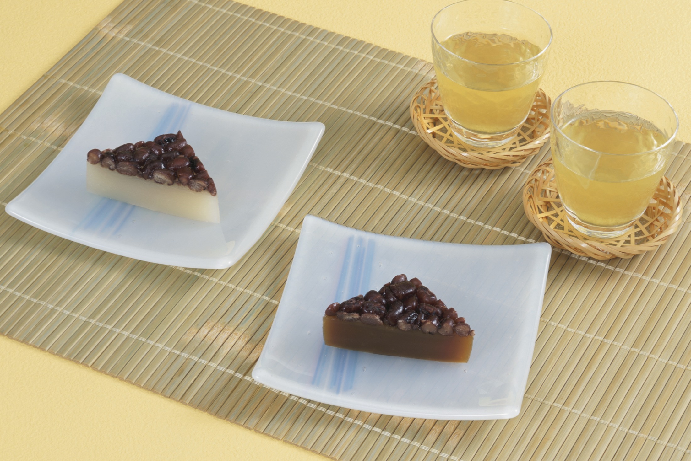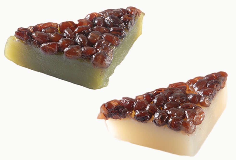 白いういろうの上面に甘く煮た小豆をのせ、三角形に切り分けたものです。