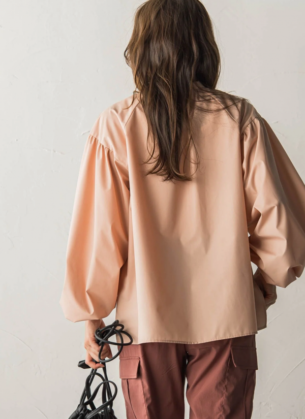 たっぷりとしたボリュームで丸みのある袖が女っぽい、バンドカラー・シャツです✨