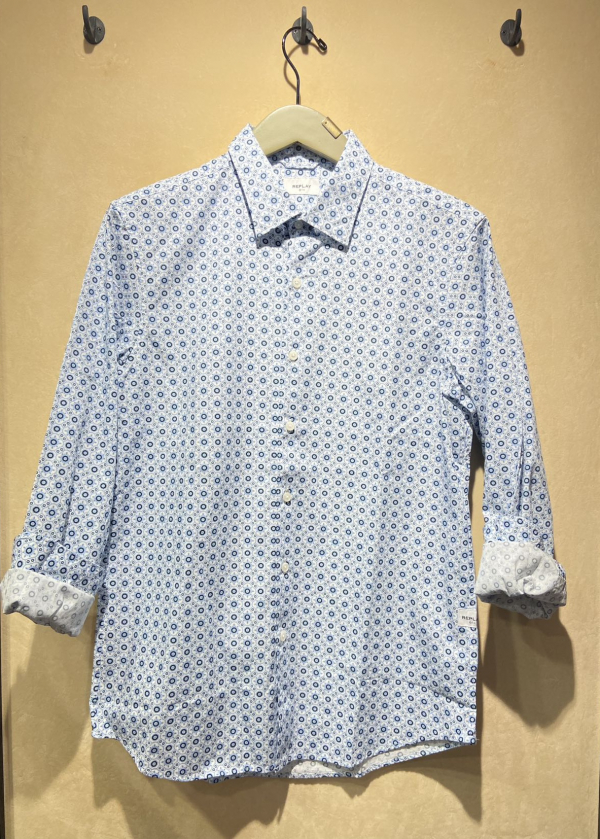 REPLAYの織りネームがサイドに付いた、シンプルな丸首プルオーバーのハイゲージニットです。