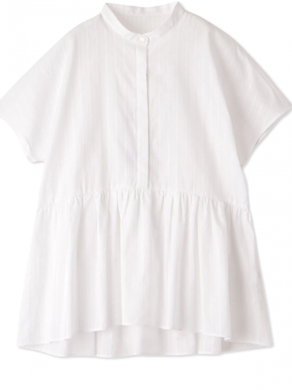 ギャザーは甘くなりすぎない分量に抑え、袖丈も長めに設定しているので