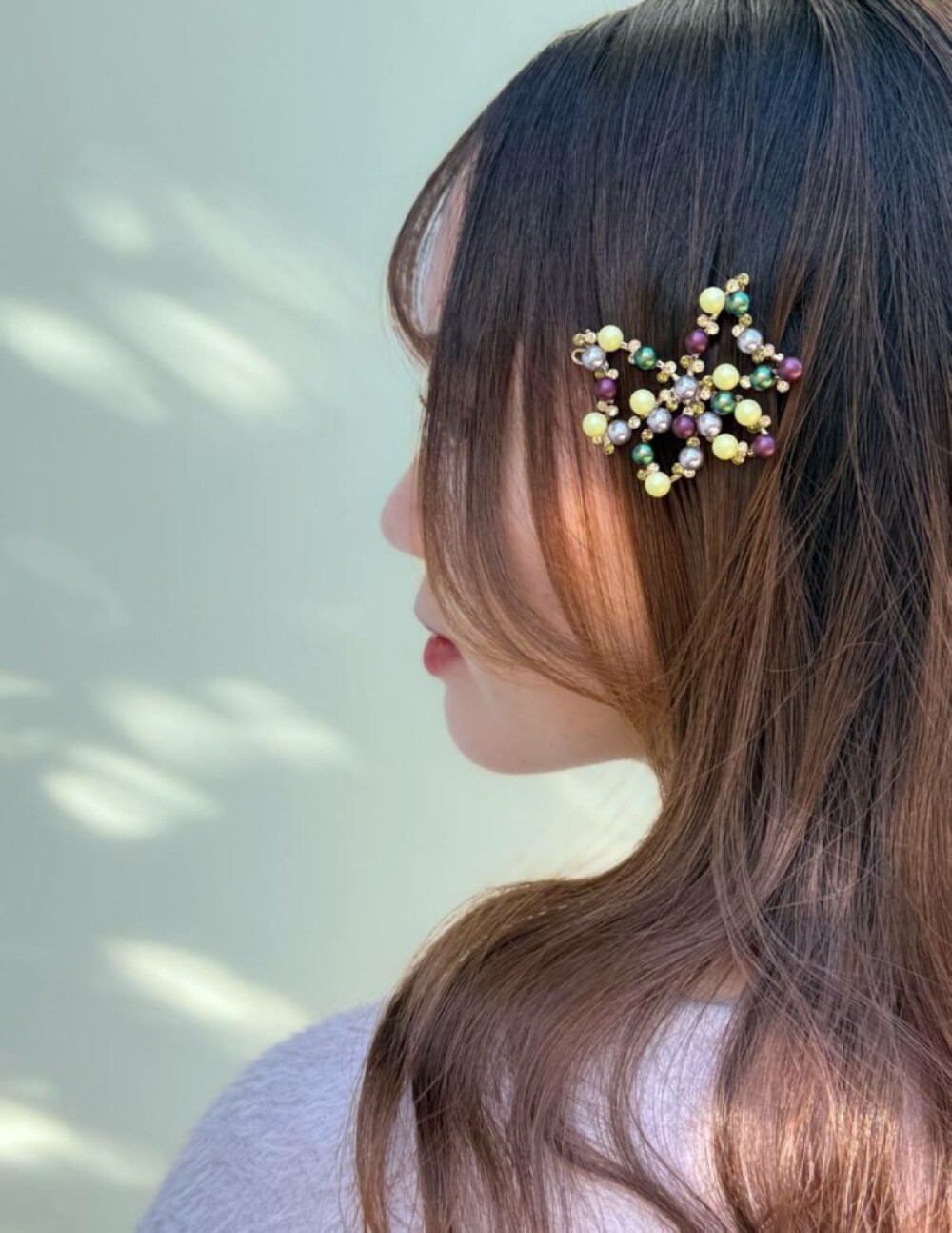 サイドにピンのように、またはポニーテールの上に飾ったり、
