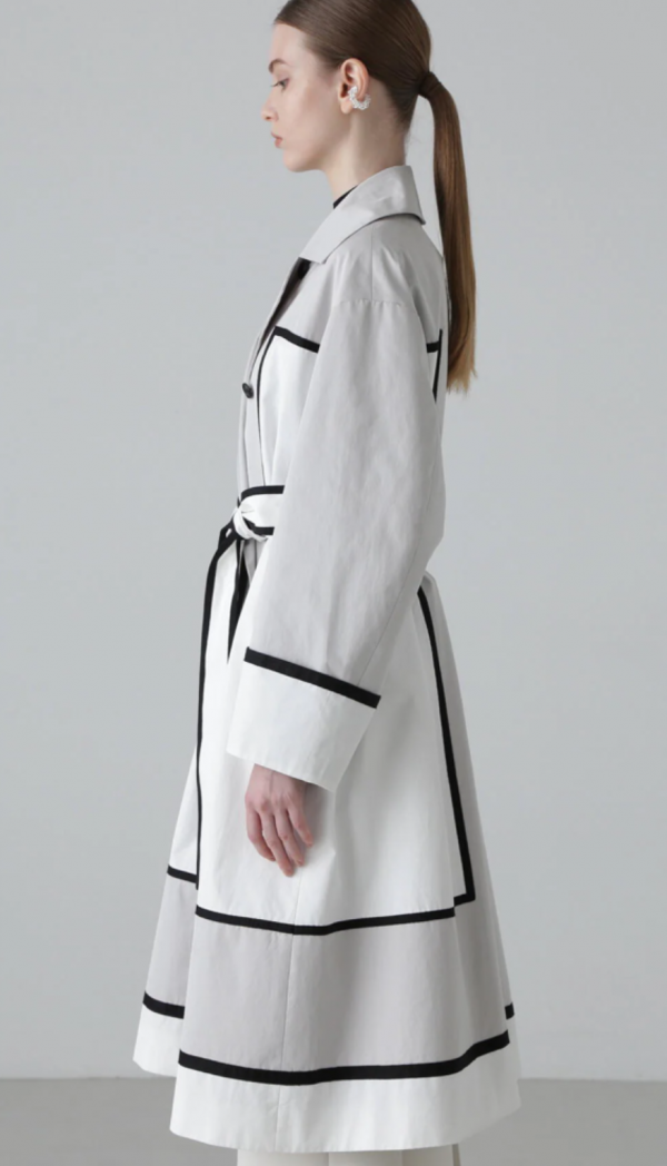 カラーの切り替えを黒いグログランで縁取り、オプティカルな印象のトレンチコートです。