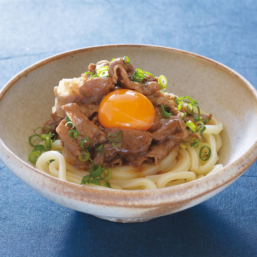 ③冷凍うどんは、表記通りに電子レンジで加熱し、器に盛って、2、卵黄、青ねぎをのせる。